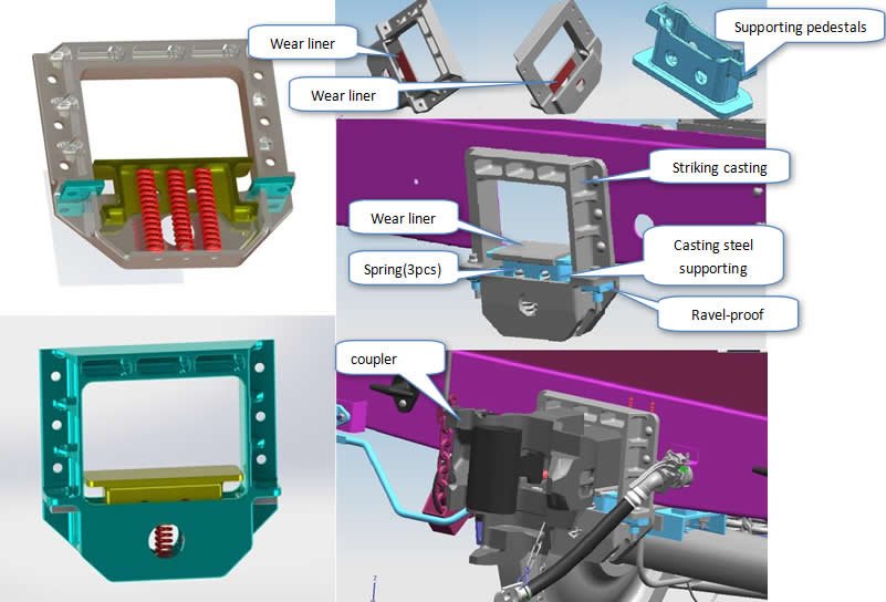 Casting steel supporting pedestals is located in the striking casting,inside are springs,two sides are ravel-proof block,upside is wear liner. This structure can largely release and relief the impact of coupler to striking casting in the running of wagon,by this way,striking casting and coupler can both extend service life. This kind of striking casting is popularly and widely used on millions of wagons.
